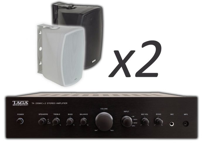 Zestaw przeznaczony jest do nagłośnienia powierzchni nie przekraczającej 30 m². W skład zestawu wchodzą: 2 głośniki naścienne TAGA Harmony TOS-600 V.2, oraz wzmacniacz TA-250MIC