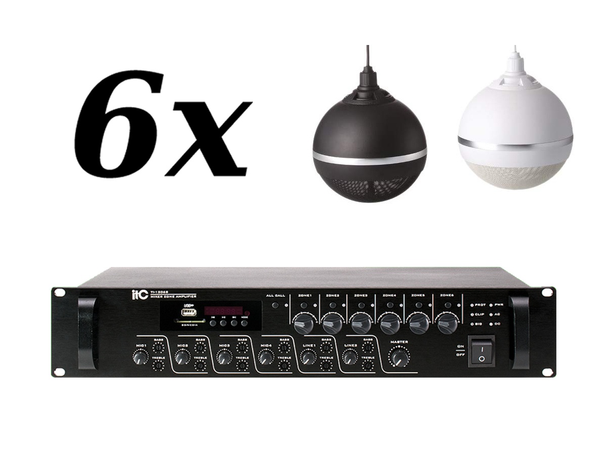 Zestaw przeznaczony jest do nagłośnienia powierzchni nie przekraczającej 100 m². W skład zestawu wchodzi: 6 głośników kulowych AMC SL 20M oraz wzmacniacz ITC TI-1206S