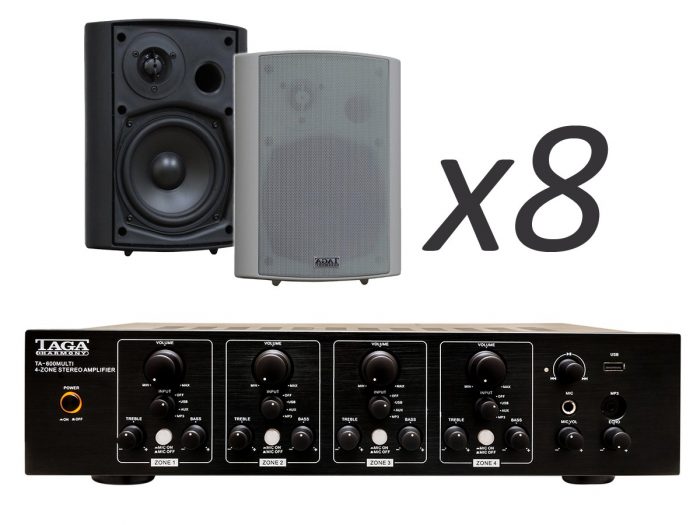 Zestaw przeznaczony jest do nagłośnienia powierzchni nie przekraczającej 150 m². W skład zestawu wchodzą: 8 głośników naściennych TAGA Harmony TOS-415 V.2, oraz wzmacniacz TA-600MULTI