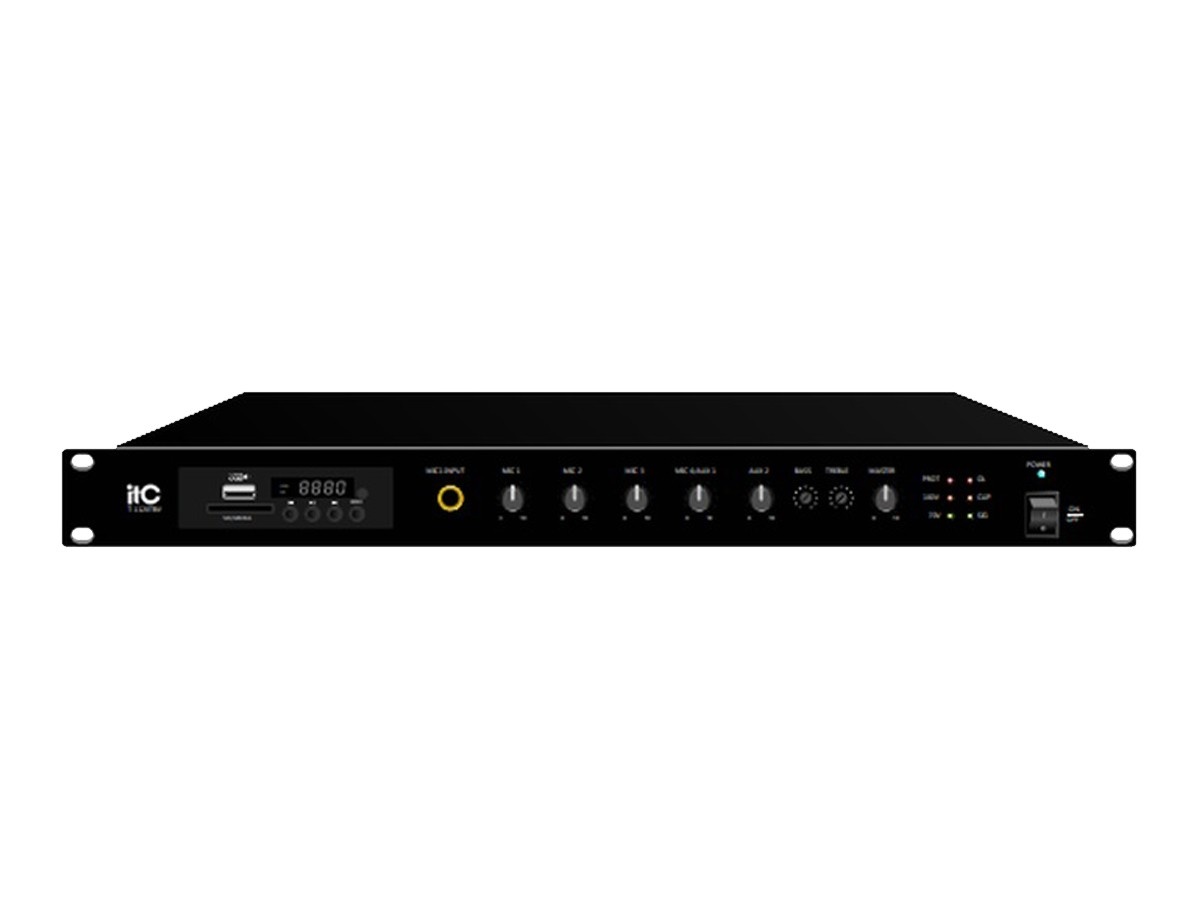 Centrala nagłośnień T-1240TBV marki ITC Audio przeznaczona jest dla systemów radiowęzłowych Public Address 100V, dostarczając muzykę tła, komunikaty słowne i alarmowe w małych i średnich obiektach. Doskonale sprawdzi się w sklepach, poczekalniach, czy szkołach. Posiada wzmacniacz miksujący z wbudowanym odtwarzaczem MP3 z wejściem USB i slotem kart SD. Poza tym, tuner radiowy AM/FM z automatyczną funkcją programowania stacji radiowych oraz odbiornikiem Bluetooth, dzięki któremu mamy możliwość współpracy z urządzeniami mobilnymi. Ponadto wzmacniacz umożliwia rozgłaszanie muzyki z innych źródeł.