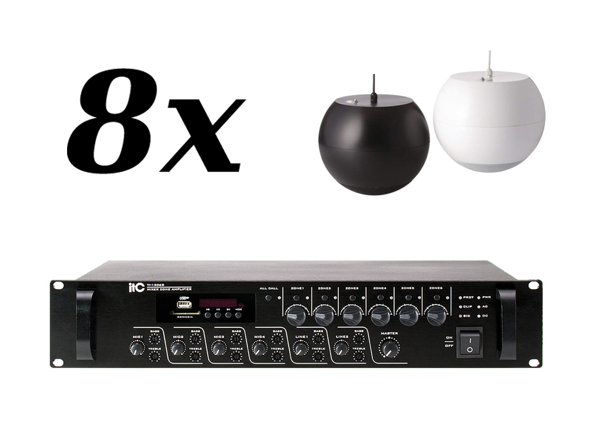 Zestaw przeznaczony jest do nagłośnienia powierzchni nie przekraczającej 150 m². W skład zestawu wchodzi: 8 głośników kulowych AMC SL 30 oraz wzmacniacz ITC TI-2406S