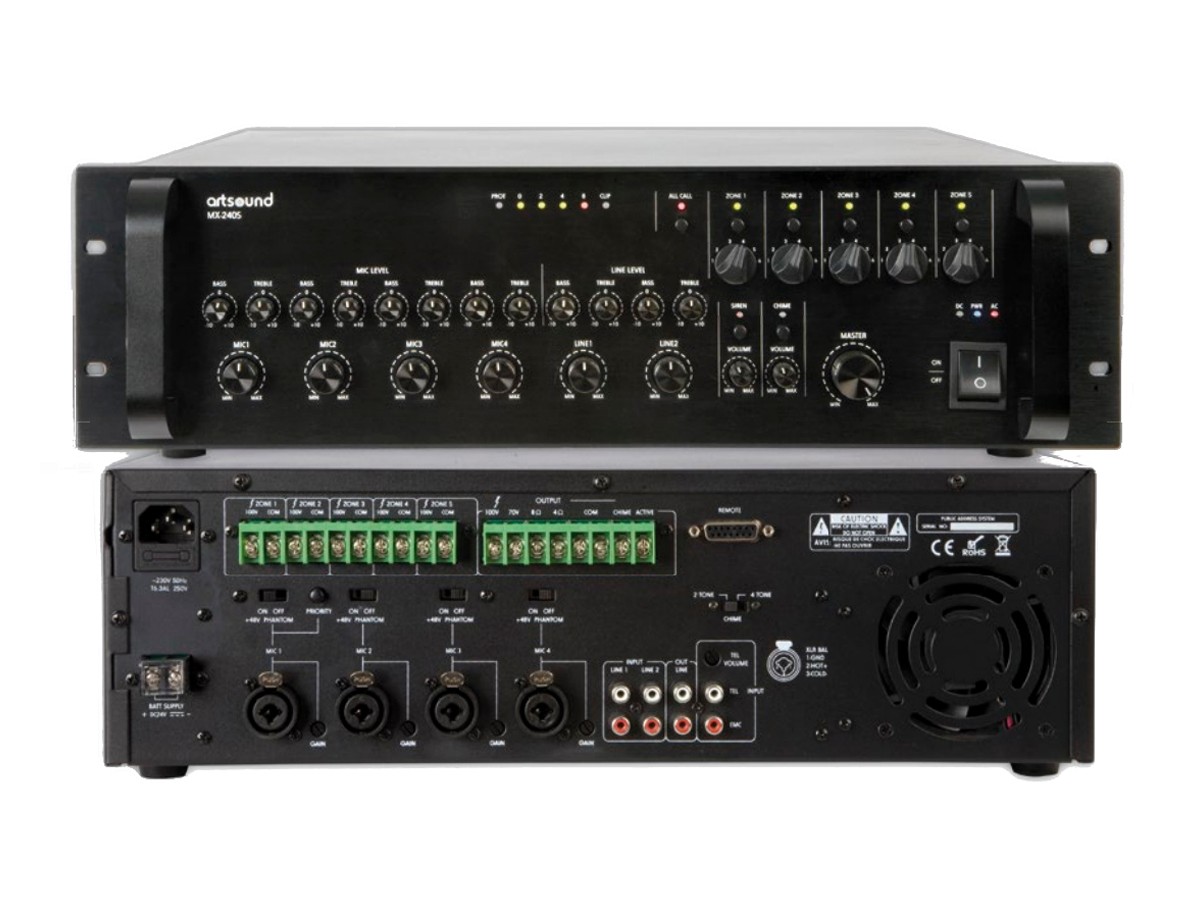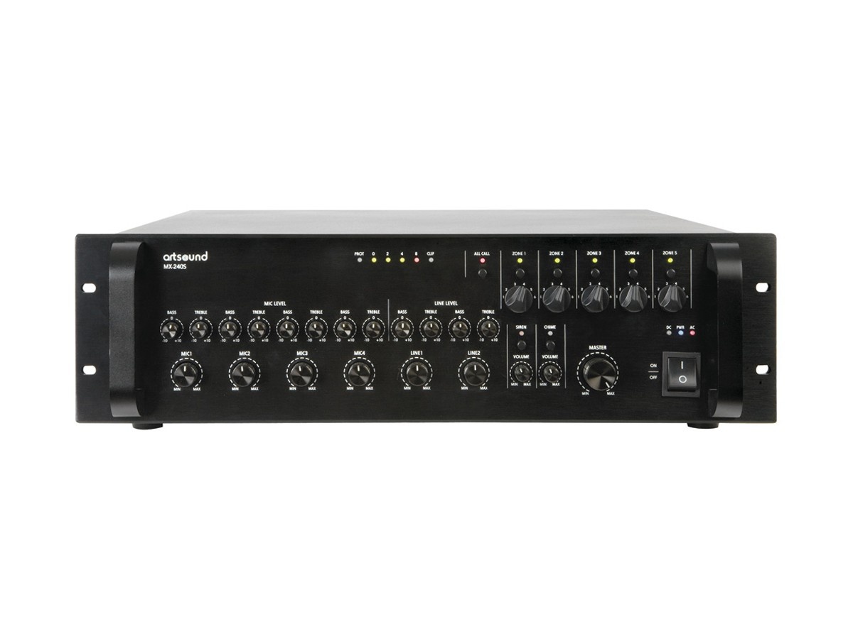 ArtSound MX-240S to uniwersalny wzmacniacz miksujący, zdolny do pracy w instalacjach 70V i 100V oraz z głośnikami o impedancji 4-16 ohm. MX-240S posiada wbudowany tuner AM/FM z aż 100 programami, dzięki czemu MX-240S jest świetnym wzmacniaczem do użytku np. w zakładzie pracy.