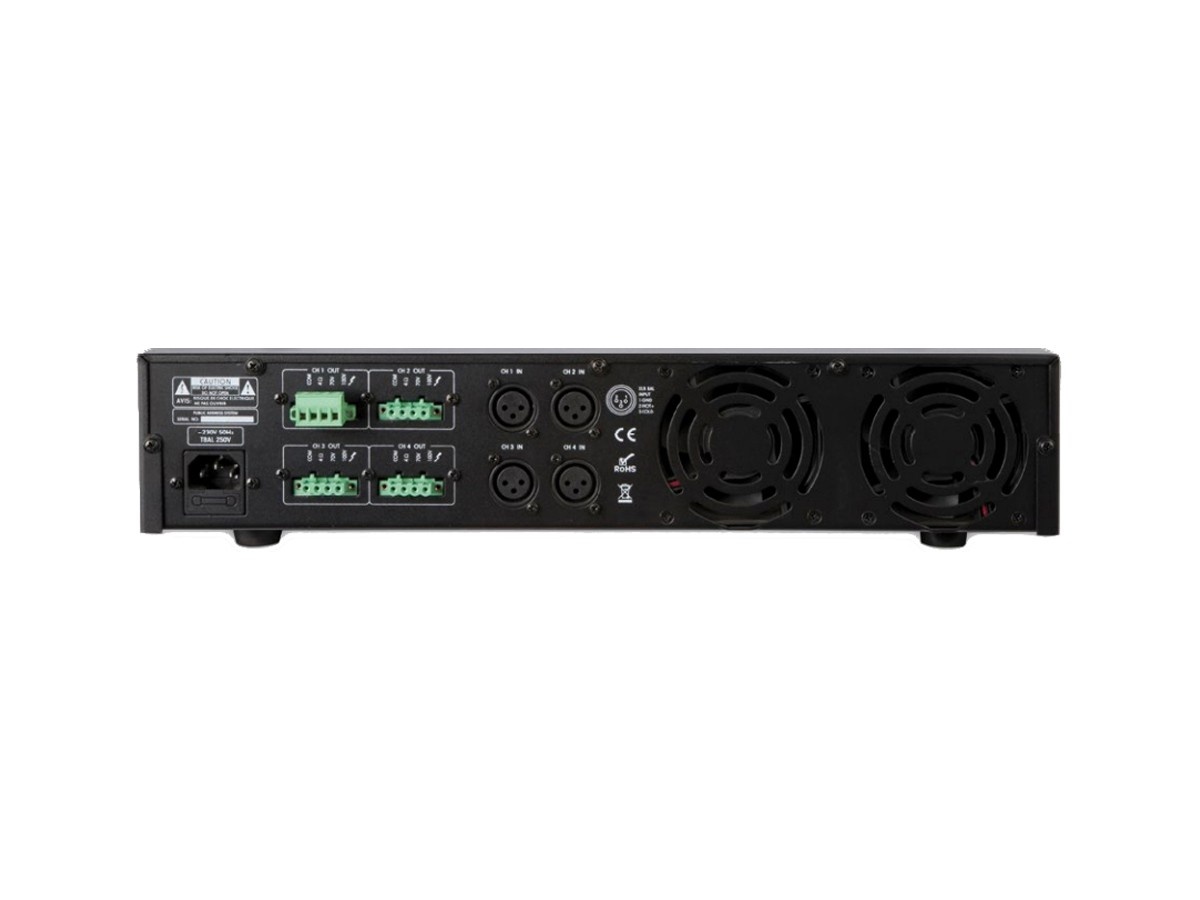 Dexon T 4D120 to profesjonalny wzmacniacz końcowy klasy D o mocy 4 x 120 W / 100 V, wyróżniający się wysoką sprawnością >85%, aktywnym chłodzeniem, ochroną przed przeciążeniem i kompaktową budową (66 mm). Idealny do szaf rack, z zasilaczem APFC i zaawansowanymi funkcjami bezpieczeństwa. Perfekcyjny do dużych systemów nagłośnienia!