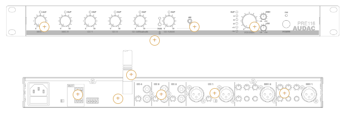 Urządzenie oferuje bogaty zestaw wejść: 2 wejścia mikrofonowe z zasilaniem Phantom, 1 symetryczne wejście liniowe XLR, 3 niesymetryczne wejścia RCA, zintegrowany Bluetooth oraz złącze 3,5 mm mini-jack na przednim panelu. Obydwa ostatnie są zmiksowane odpowiednio z kanałami 3 i 4, co pozwala w prosty sposób podłączyć urządzenia mobilne – zarówno przewodowo, jak i bezprzewodowo. Taka konfiguracja czyni AUDAC PRE116 niezwykle elastycznym przedwzmacniaczem mikrofonowo-liniowym, który można łatwo dostosować do zmieniających się potrzeb instalacji.