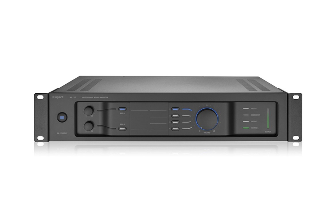 BIAMP – APART MA120 to uniwersalny wzmacniacz miksujący o mocy 120W w trybie 70V lub 100V. Wzmacniacz może być wykorzystywany jako źródło zasilania instalacji audio zarówno w budynkach o charakterze komercyjnym jak i obiektach przemysłowych.