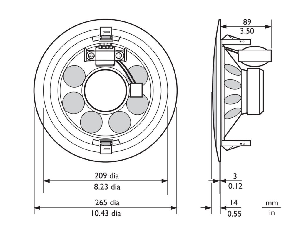 Głośnik posiada dwa sprężynujące uchwyty, które pewnie utrzymują moduł w otworze w suficie (w przypadku sufitów podwieszanych i płyt ściennych o grubości od 9 do 25 mm). Głośnik jest dostarczany wraz z odpowiednim szablonem do wycięcia otworu montażowego o śr. 210 mm.