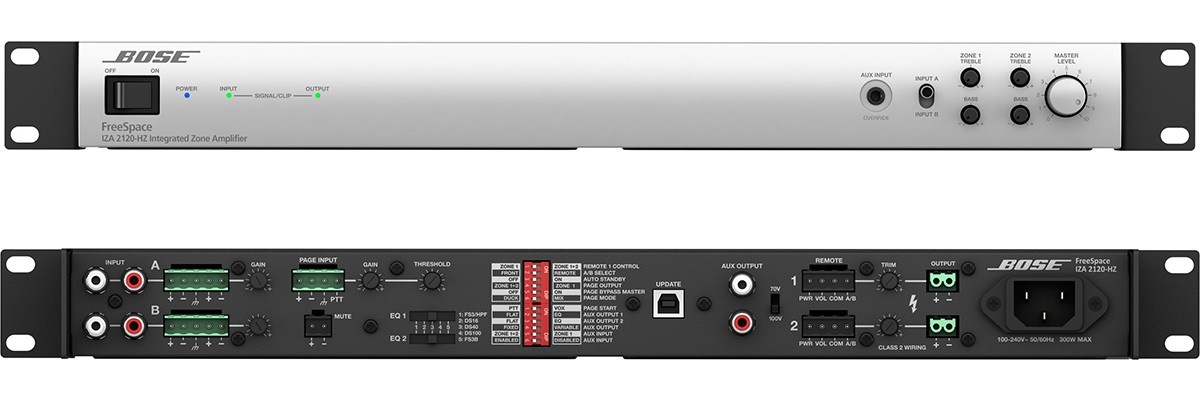 Dzięki wejściom 2 × stereo RCA i 2 × Euroblock, a także wejściu przywoławczemu i pomocniczemu, wzmacniacz Bose FreeSpace IZA 2120-HZ oferuje dużą elastyczność pod względem integracji z różnymi źródłami dźwięku. Wyjścia Euroblock oraz stereofoniczne RCA pozwalają na rozszerzenie systemu i jego dalsze dostosowanie do potrzeb użytkownika. Urządzenie współpracuje również z kontrolerami strefowymi Bose CC-2 i CC-3, co umożliwia zdalne sterowanie poziomem głośności i wyborem źródła w różnych strefach.