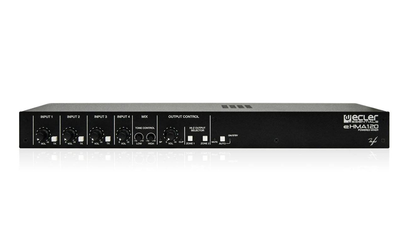 ECLER ESSENTIALS eHMA120 to wzmacniacz miksujący wyposażony w trzy wejścia MIC / LINE ST, jedno wejście LINE ST i jedno wyjście monofoniczne. Obsługuje zarówno linie głośnikowe niskiej (4Ω), jak i wysokiej impedancji (70V, 100V), z niezależnymi przełącznikami ON / OFF (strefa 1, strefa 2). Posiada funkcję priorytetu sygnału audio (komunikaty głosowe, sytuacje awaryjne itp.) dostępną na 3 wejściach, pager i wbudowaną funkcję gongu (kompatybilny z 1-strefowymi mikrofonami przywoławczymi), 2-punktowa kontrolę tonów, automatyczny tryb czuwania (stand-by), port MUTE i uniwersalny zasilacz, kompatybilny z zewnętrznymi systemami zasilania awaryjnego 24 VDC.