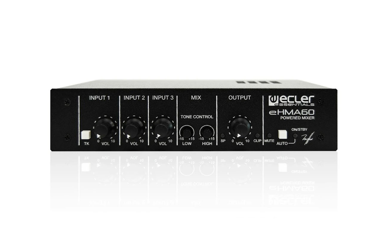 Ecler eHMA60 to powermikser wyposażony w wejście MIC oraz dwa wejścia MIC/LINE ST. Moc eHMA60 to 60W dla zarówno niskiej impedancji (4 Ohm) jak i wysokiej (70V, 100V). Powermikser obsługuje funkcję audio priority. Urządzenie posiada 2 regulacje tonów oraz funkcję auto stand-by i wyciszenie portów, a także zasilacz 24VDC.