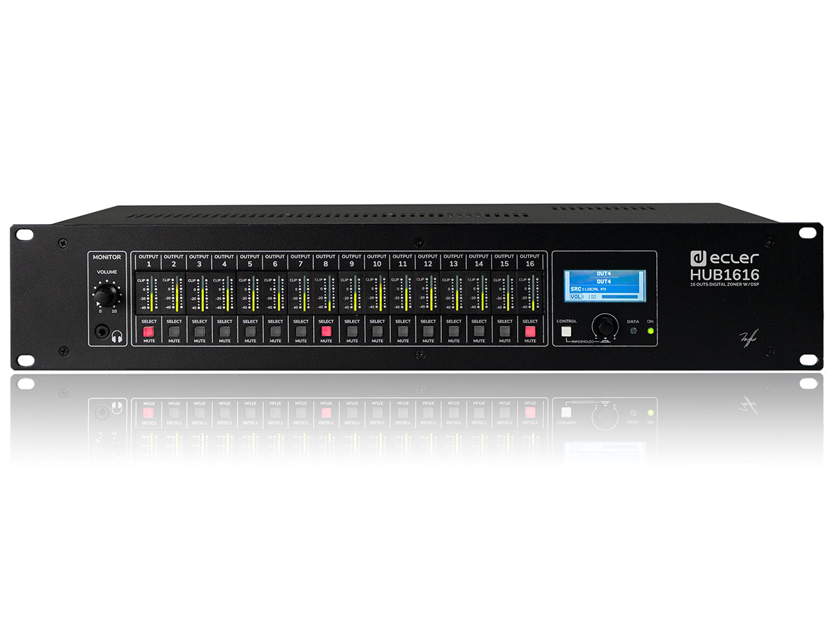 Ecler HUB1616 to cyfrowy mikser instalacyjny z 16 wejściami i 16 wyjściami. HUB1616 ma 4 wejścia MIC/MONO LINE, 4 wejścia LINE/ST oraz 8 wejść REMOTE LINE. Mikser posiada wbudowany procesor DSP. Urządzenie od Ecler ponadto daje możliwość sterowania za pomocą urządzeń mobilnych poprzez aplikację ECLER PILOT, która jest kompatybilna z systemami iOS i Android.