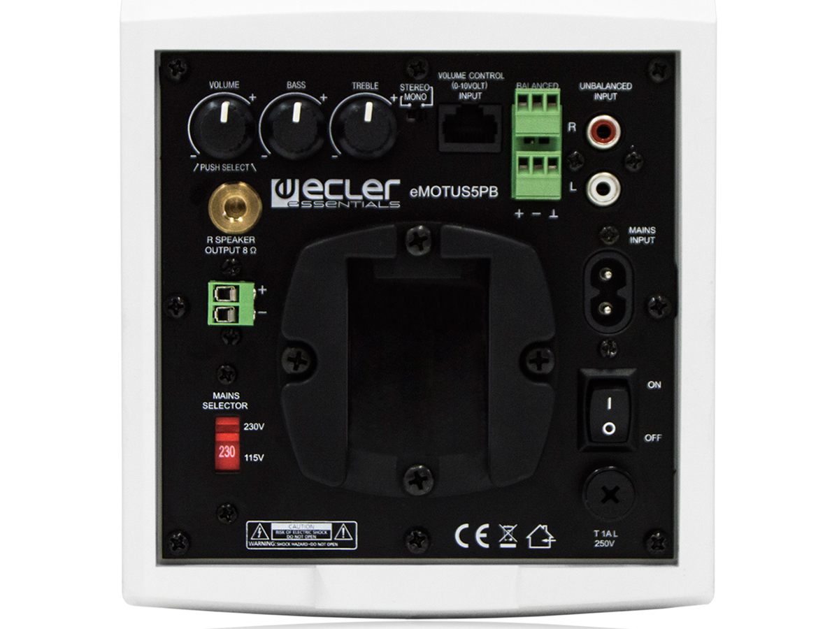 ECLER ESSENTIALS eMOTUS5PB to zestaw głośników stereo zawierający głośnik aktywny i pasywny, posiadający 2 wejścia audio: symetryczne i niesymetryczne, a także możliwość połączenia bezprzewodowego BT. Ponadto zestaw zawiera pilot IR oraz port zdalnego sterowania głośnością 0-10VDC. Profesjonalny i kompaktowy zestaw to przyjazne dla użytkownika i opłacalne rozwiązanie z fantastyczną wydajnością i unikalnym designem, który z łatwością wpasuje się do ogromnej liczby aplikacji multimedialnych: sal edukacyjnych, sal konferencyjnych, sklepów detalicznych itp. Dostępne w kolorze białym. Zestaw zawiera uchwyt ścienny i stalową linkę zabezpieczającą.