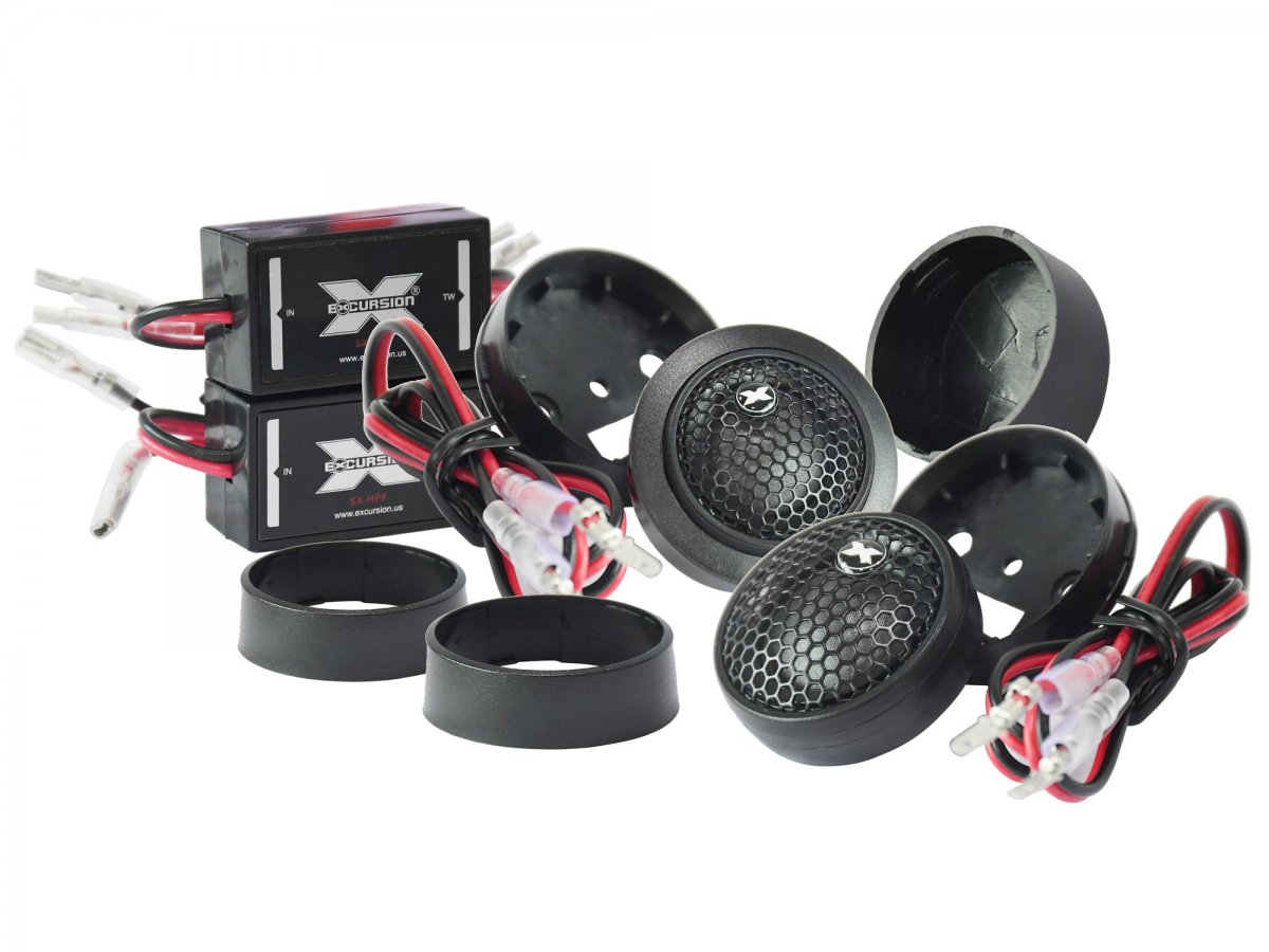 Samochodowe głośniki wysokotonowe marki Excursion posiadające membrany kopułkowe o średnicy 20 mm wykonane z czystego naturalnego jedwabiu, które w tym przedziale cenowym są praktycznie bez konkurencji. Głośniki charakteryzują się wysoką skutecznością oraz naturalnie zrównoważonym i szczegółowym brzmieniem najwyższych tonów pasma akustycznego. Podczas projektowania dużą wagę przywiązano do towarzyszącego osprzętu, aby nie marnować wysokiego potencjału tych głośników. Począwszy od doboru optymalnych połączeń wtykowych, poprzez wysokiej jakości kable głośnikowe z miedzi beztlenowej (OFC), aż po możliwie najmniejsze, ale zbudowane bez oszczędności zwrotnice pasywne wyposażone w wysokiej jakości kondensatory audio MKP zamontowane na płytkach drukowanych z solidnymi miedzianymi ścieżkami. Te małe pasywne filtry górnoprzepustowe (HPF) są idealnym rozwiązaniem pozbawionym całego niepotrzebnego balastu akcesoriów i gadżetów, które tylko nadmiernie „obciążają” dźwięk i portfel. Zwrotnice umożliwiają bardzo wygodny i łatwy montaż, elastyczny wybór polaryzacji oraz redukcję poziomu sygnału od 2 do 10 dB przy współpracy z opcjonalnymi tłumikami rezystancyjnymi Excursion XLR. W zestawie znajdują się również obudowy montażowe umożliwiające indywidualne ukierunkowanie głośników i szeroki zakres regulacji kąta propagacji dźwięku.