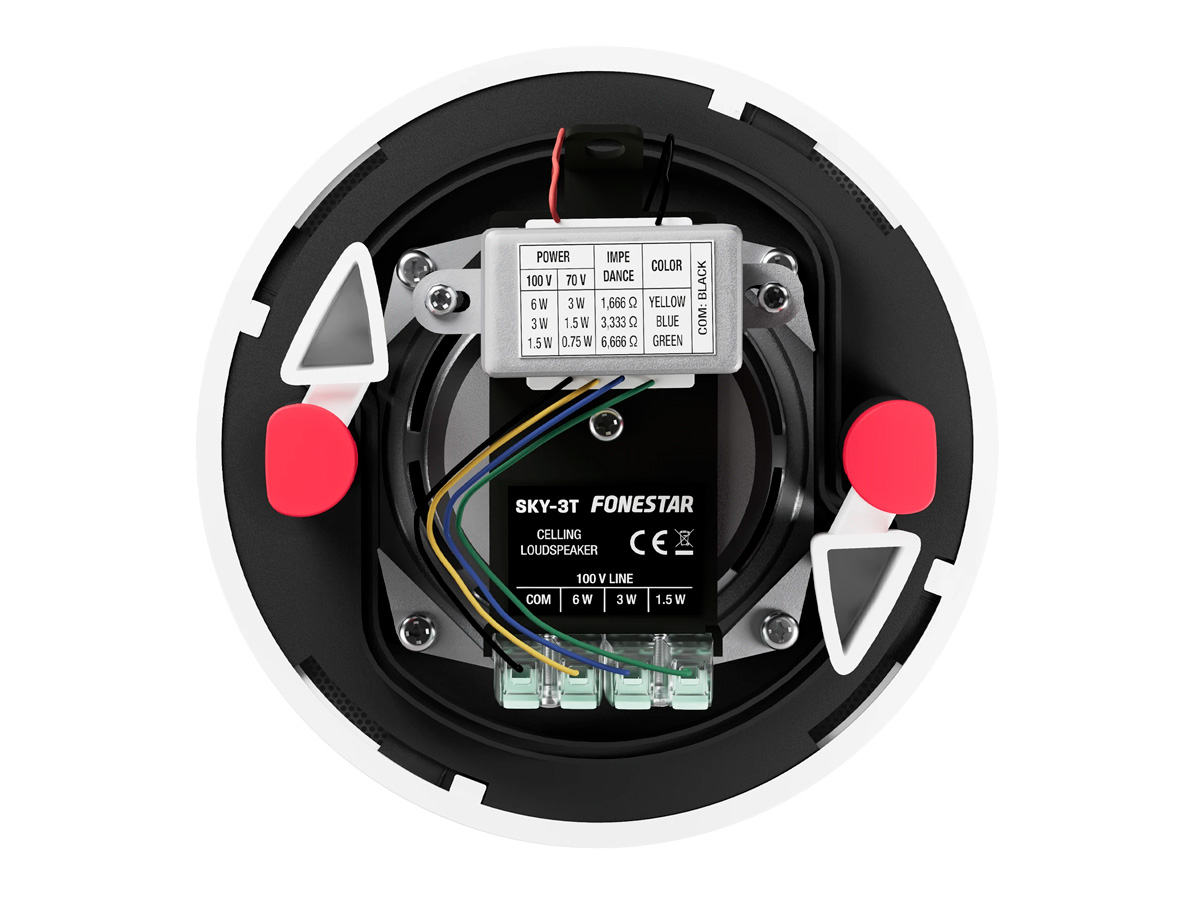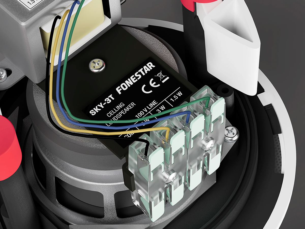 Głośnik sufitowy FONESTAR SKY 3T został zaprojektowany z myślą o pracy w systemach 100V, co czyni go idealnym wyborem do większych instalacji wymagających wielu punktów nagłośnienia. Dzięki temu możliwe jest łatwe i efektywne rozprowadzenie dźwięku na dużej powierzchni bez utraty jakości i bez konieczności stosowania skomplikowanej infrastruktury wzmacniającej.