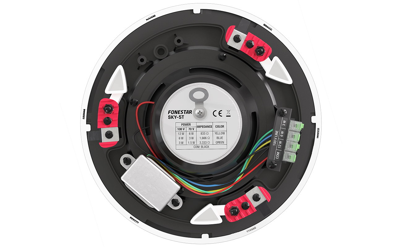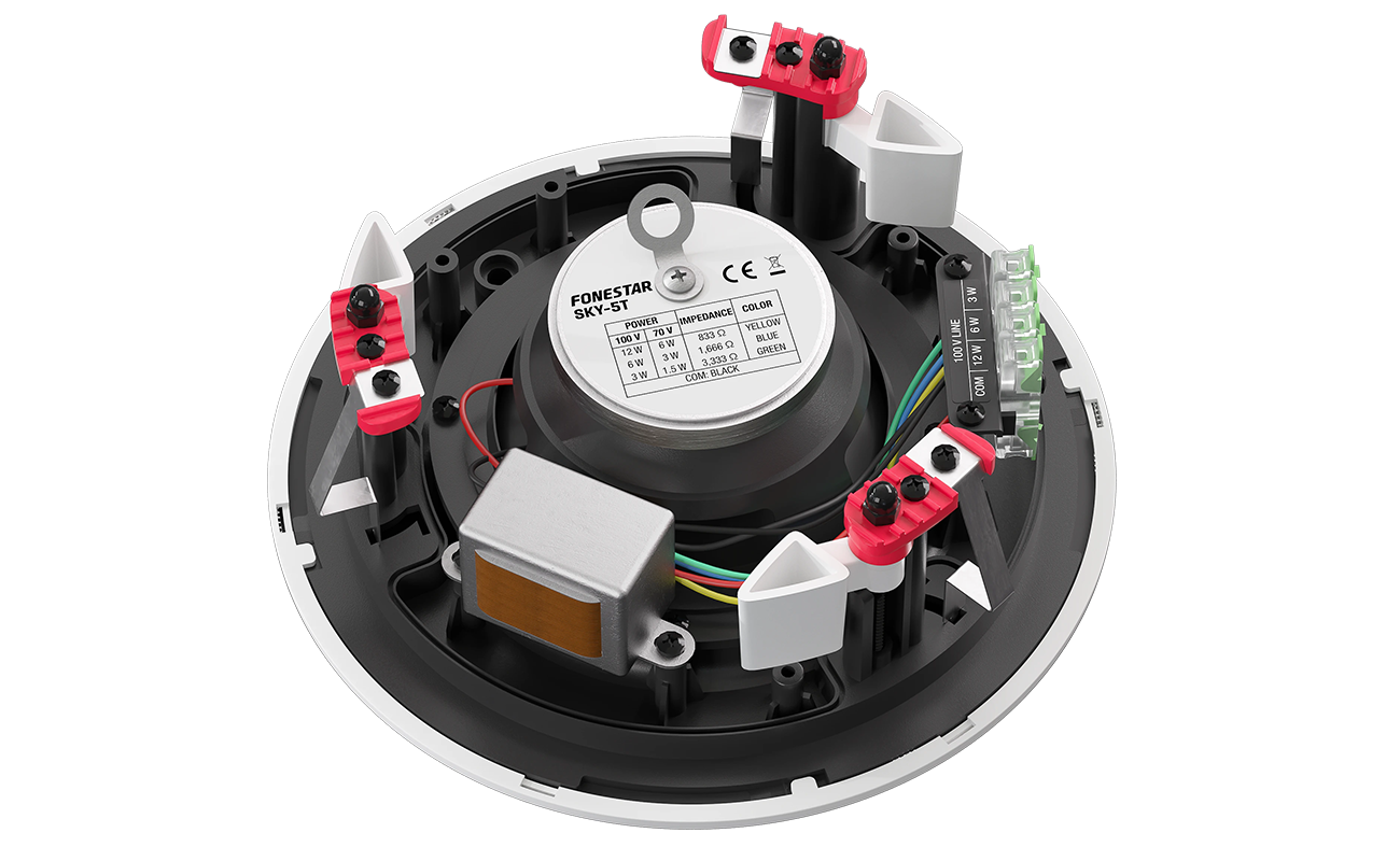 Fonestar SKY-5T to głośnik sufitowy zaprojektowany z myślą o zastosowaniach profesjonalnych, które wymagają nie tylko wysokiej jakości dźwięku, ale także subtelnej integracji z przestrzenią. Dzięki eleganckiej, pozbawionej ramki maskownicy wykonanej z odpornego na rdzę aluminium, głośnik wtapia się w otoczenie, nie rzucając się w oczy. Maskownica jest nie tylko zdejmowana i blokowana na obrót, ale również umożliwia usunięcie logo oraz jej przemalowanie, co daje pełną dowolność dopasowania do wnętrza – czy to w biurach, przestrzeniach komercyjnych, czy też miejscach użyteczności publicznej.