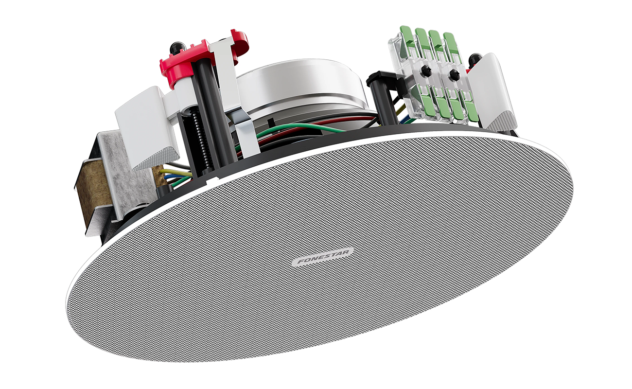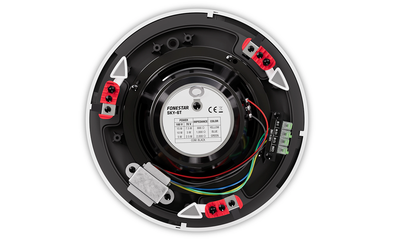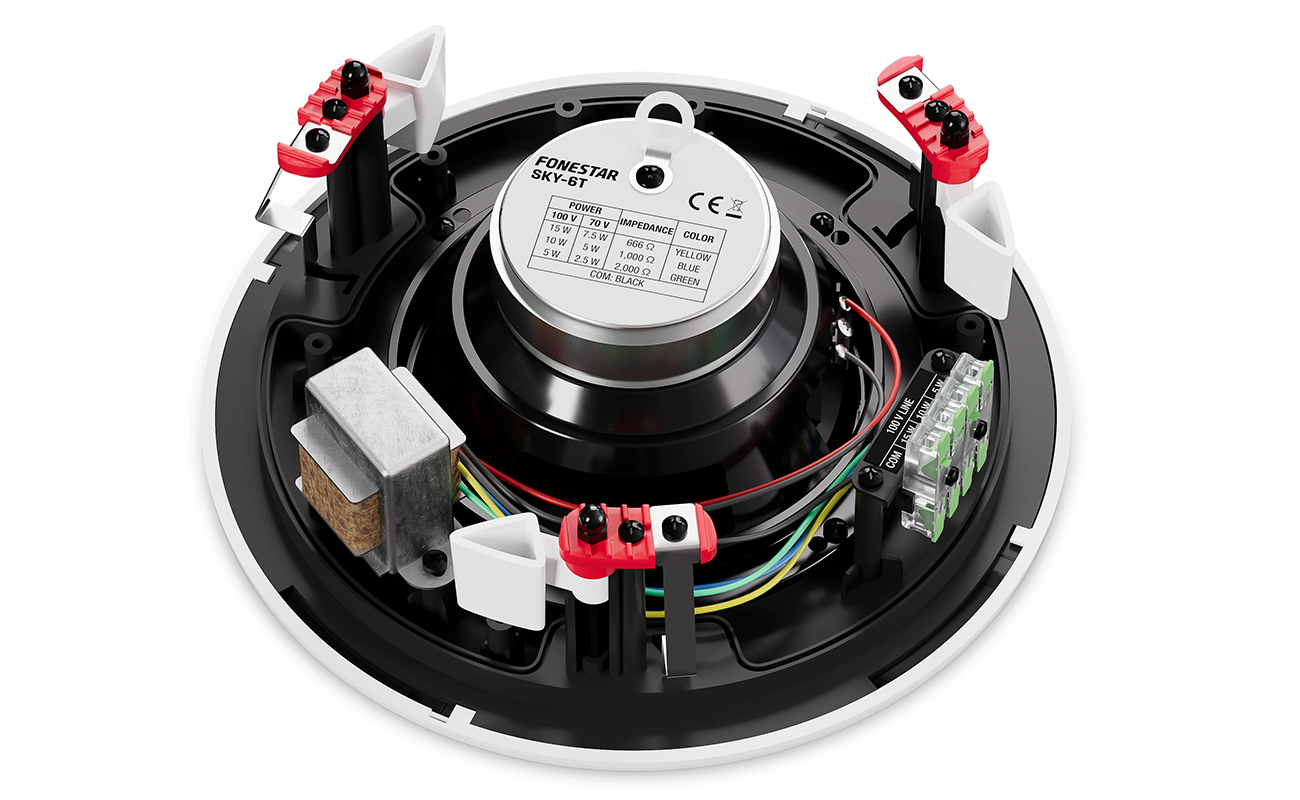 Wbudowany transformator linii 100 V zapewnia zgodność z systemami profesjonalnego nagłośnienia, a szybkozłączki o wysokiej przewodności znacząco ułatwiają montaż. W celu zwiększenia bezpieczeństwa, Fonestar SKY-6T wyposażony jest także w system zabezpieczający przed upadkiem oraz dodatkowe haki do podpięcia kabla asekuracyjnego. Całość dopełniają stabilne uchwyty śrubowe z przekładnią ślimakową, które zapewniają precyzyjne i solidne zamocowanie w suficie.