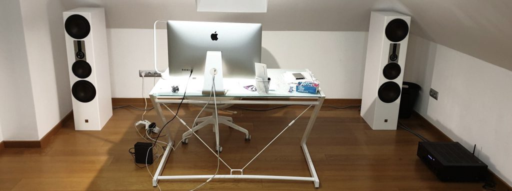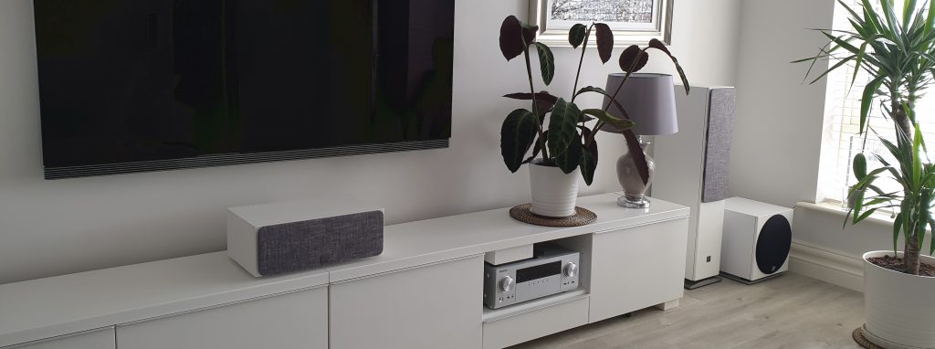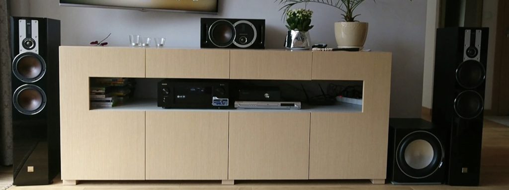 Instalacja domowa oparta na kolumnach Oberon 7 marki Dali. Jako wzmocnienie niskich tonów dodano subwoofer Dali E-12.