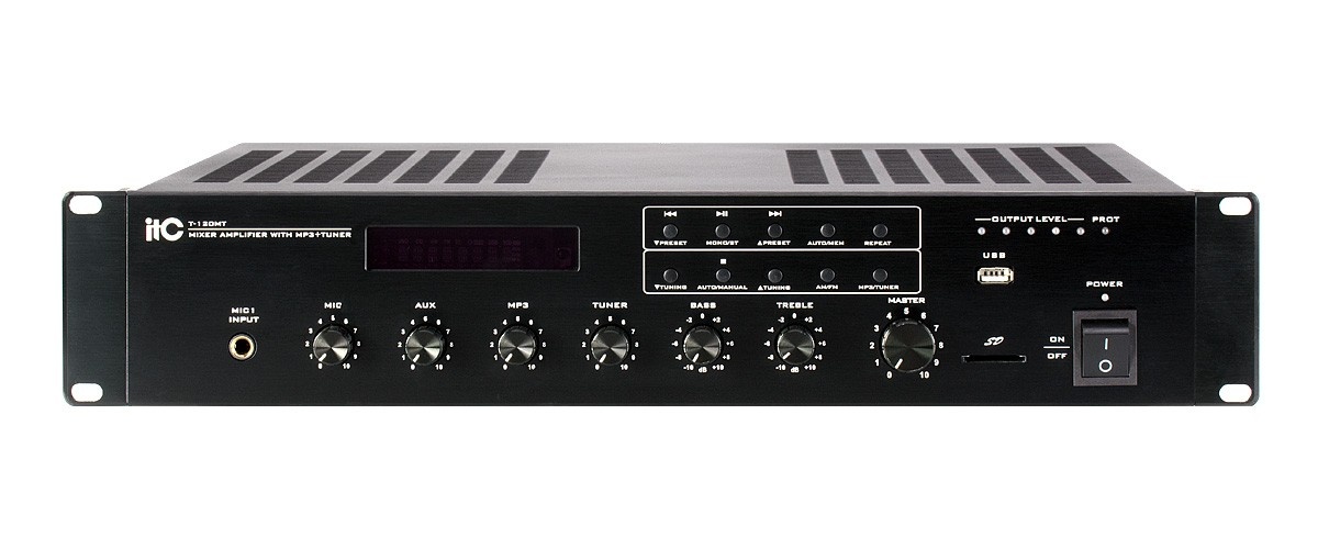 ITC Audio T-120MT to jednostrefowa centrala nagłośnienia 120W, przeznaczona do instalacji Public Address 100V w małych i średnich obiektach. Idealnie nadaje się do szkół, sklepów, poczekalni czy biur, gdzie istotne jest połączenie niezawodności z prostą obsługą. Urządzenie umożliwia nadawanie muzyki tła, komunikatów słownych i alarmowych, oferując wysoką jakość dźwięku w zakresie od 49,5 Hz do 18,5 kHz.