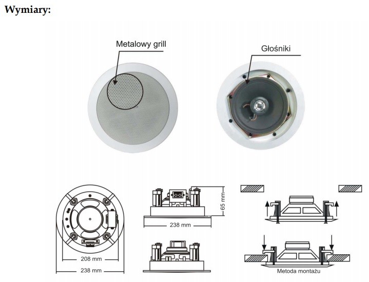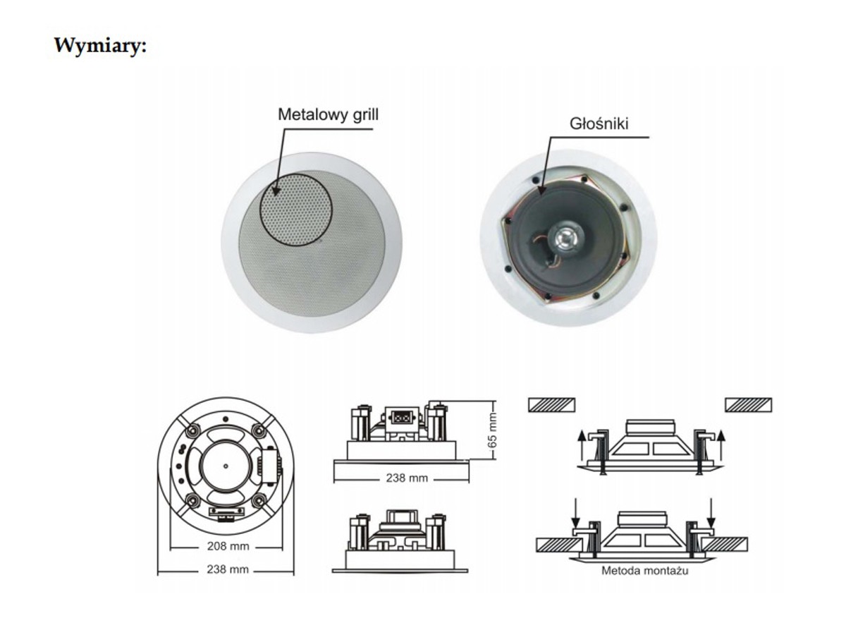 Obudowa wykonana z trwałego tworzywa ABS oraz stalowa maskownica malowana proszkowo w kolorze białym sprawiają, że głośnik wkomponuje się w wystrój każdego wnętrza. Średnica otworu montażowego fi 203 mm i kompaktowe wymiary 238 x 78 mm umożliwiają łatwy i szybki montaż przy użyciu sprężyn dociskowych oraz uchwytów śrubowych. Taka konstrukcja zapewnia stabilne osadzenie w suficie i minimalizuje ryzyko luzowania się urządzenia w trakcie użytkowania.