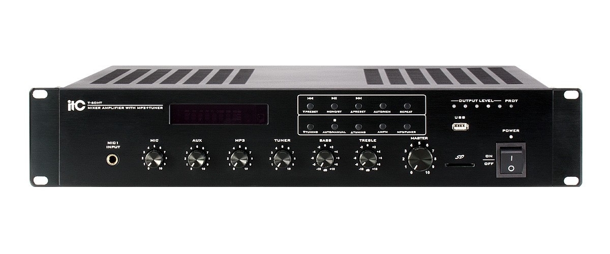 ITC Audio T-60MT to nowoczesna centrala nagłośnienia 60W, zaprojektowana z myślą o systemach Public Address 100V w małych i średnich obiektach. Jednostrefowa konstrukcja oraz rozbudowana funkcjonalność sprawiają, że idealnie sprawdzi się w szkołach, sklepach, gabinetach, poczekalniach czy małych biurach. Urządzenie umożliwia niezawodną transmisję muzyki tła, komunikatów głosowych oraz sygnałów alarmowych, oferując jednocześnie prostą i intuicyjną obsługę.