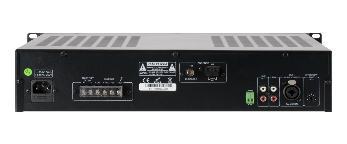 Na froncie centrali znajduje się wejście mikrofonowe Jack, a z tyłu dodatkowe gniazdo XLR – oba obsługują mikrofon MIC 1, który posiada priorytet VOX nad pozostałymi źródłami sygnału. Użytkownik może dowolnie ustawić poziom tłumienia, co gwarantuje pełną słyszalność ważnych komunikatów. Na tylnym panelu znajduje się złącze generujące sygnał GONG poprzez zwarcie konektora – idealne do sygnalizacji rozpoczęcia lekcji, przerw, czy alarmów. Całością można zarządzać również za pomocą pilota zdalnego sterowania, dołączonego do zestawu.