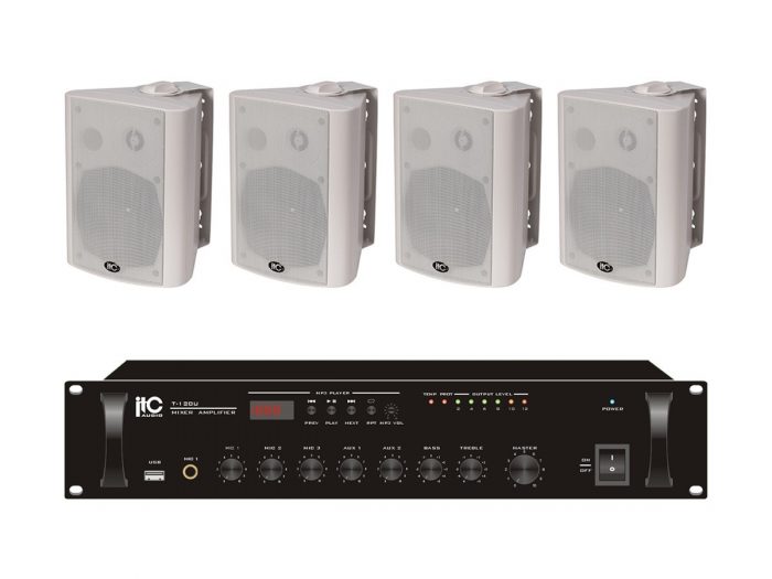 Zestaw przeznaczony jest do nagłośnienia powierzchni nieprzekraczającej 150 m². W skład zestawu wchodzi: 8 głośników naściennych ITC T-775 oraz wzmacniacz jednostrefowy ITC T-1240TBV