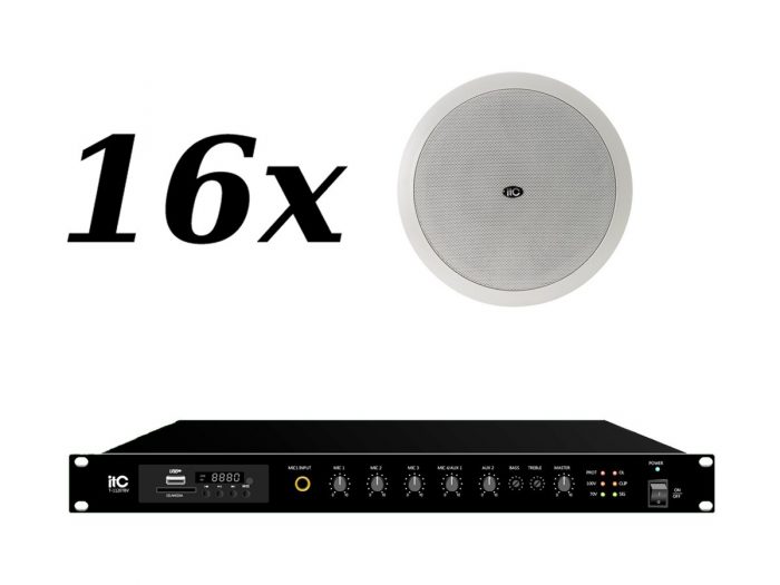 Zestaw przeznaczony jest do nagłośnienia powierzchni nie przekraczającej 300 m². W skład zestawu wchodzi: 16 głośników sufitowych ITC T-208A oraz wzmacniacz jednostrefowy ITC T-1240TBV.