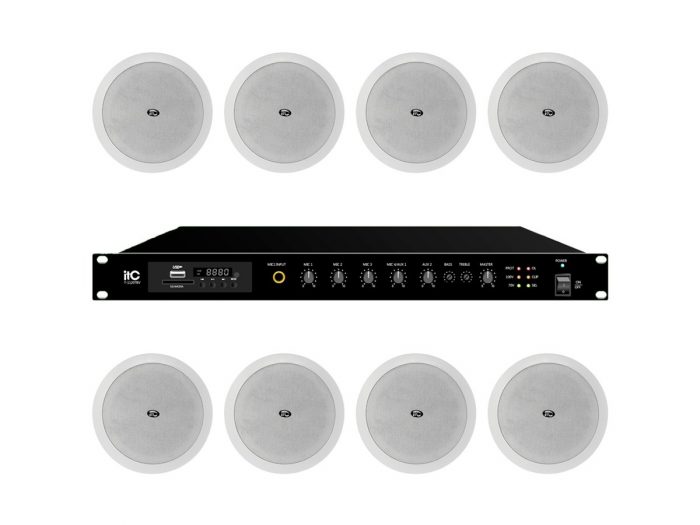 Zestaw przeznaczony jest do nagłośnienia powierzchni nie przekraczającej 150 m². W skład zestawu wchodzi: 8 głośników sufitowych ITC T-206P oraz wzmacniacz jednostrefowy ITC T-1240TBV