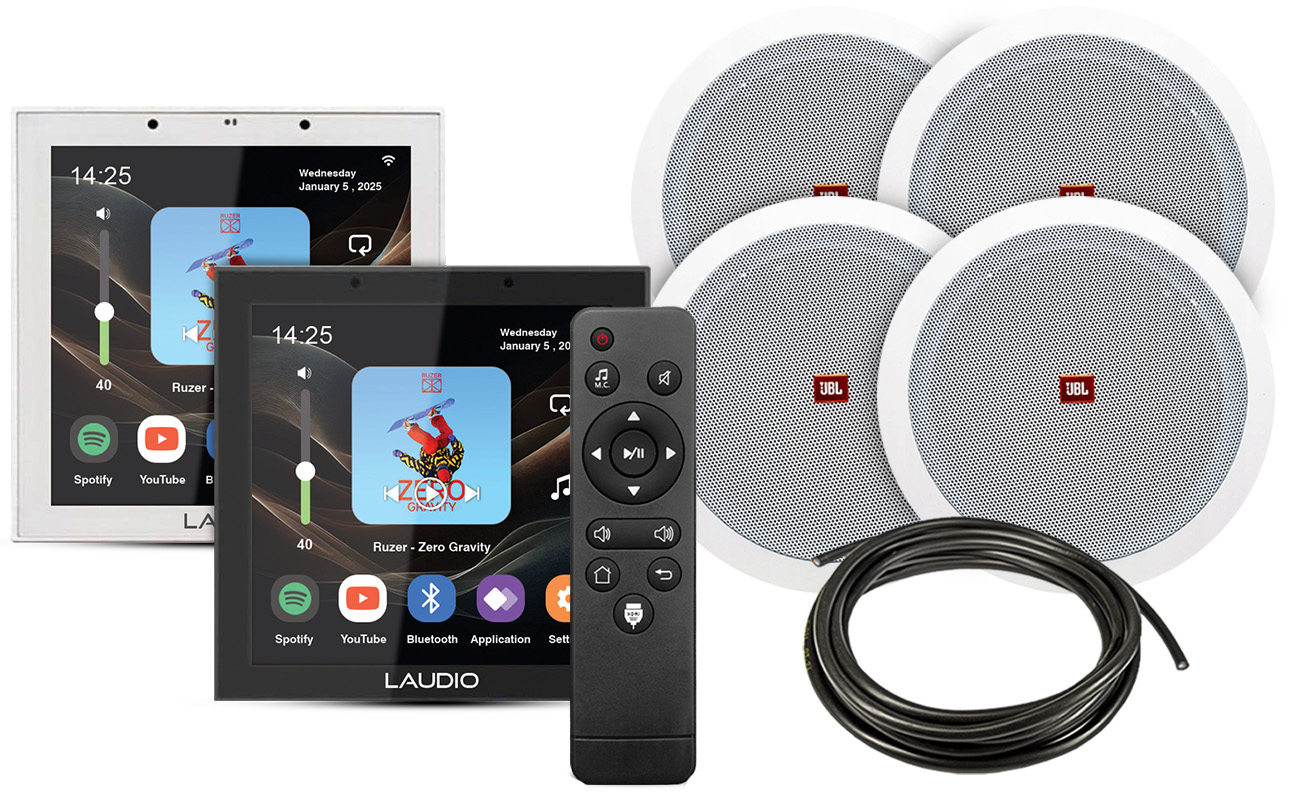 Zestaw nagłośnienia sufitowego JBL 4 Głośniki sufitowe + LAUDIO W44WIFI. Idealny do mieszkań, biur i lokali usługowych. Dyskretny montaż, wysoka jakość dźwięku i nowoczesne sterowanie dotykowe.