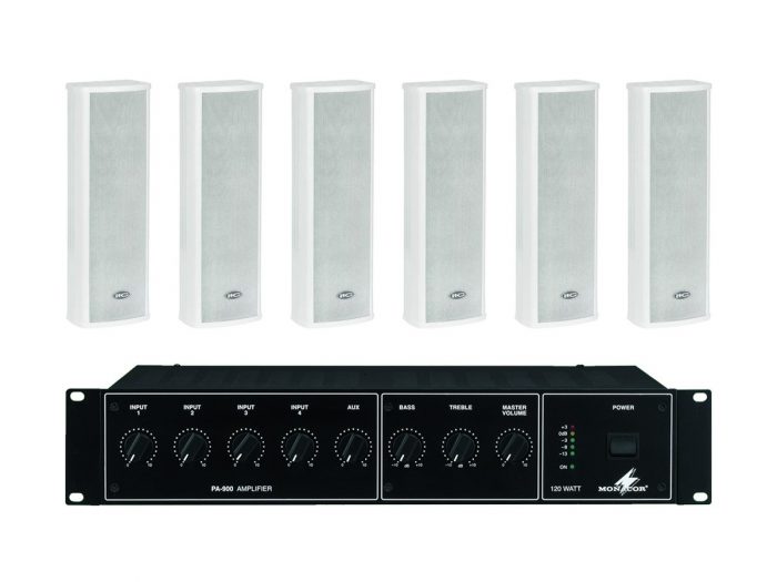 6x ITC T-702A + MONACOR PA-900 – Nagłośnienie naścienne do 100 m2