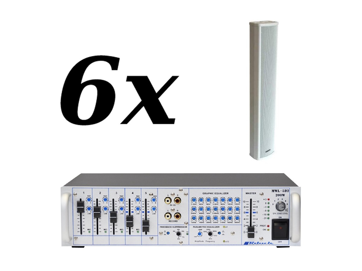 Zestaw przeznaczony jest do nagłośnienia powierzchni nie przekraczającej 100 m². W skład zestawu wchodzi: 6 kolumn naściennych RH SOUND CS-26 oraz wzmacniacz RDUCH MWL-5D2/200