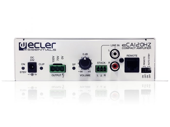 ECLER ESSENTIALS eCA120 to stereofoniczny mikro-wzmacniacz 2 x 60W RMS dla 4Ω, o bardzo kompaktowym formacie oraz lekkiej i cichej konstrukcji (brak wentylatora). Posiada 1 wejście stereo LINE, funkcję auto stand-by i port zdalnego sterowania głośnością, kompatybilny z panelami ściennymi ECLER WPa (0-10 VDC). Zewnętrzny, uniwersalny zasilacz z certyfikatem CE / UL / CCC.