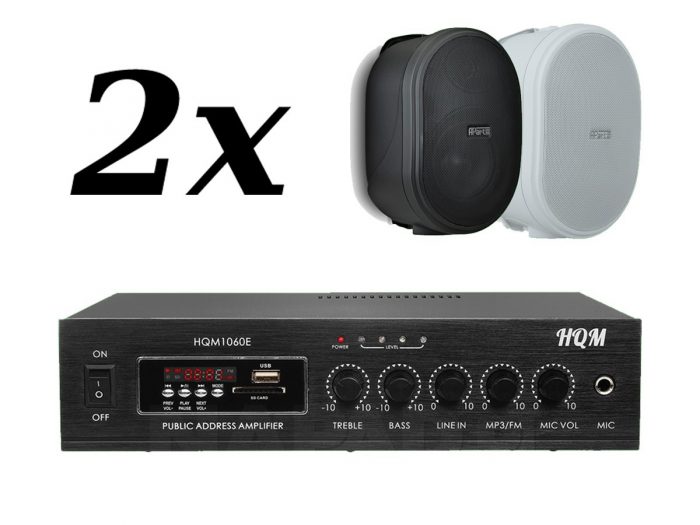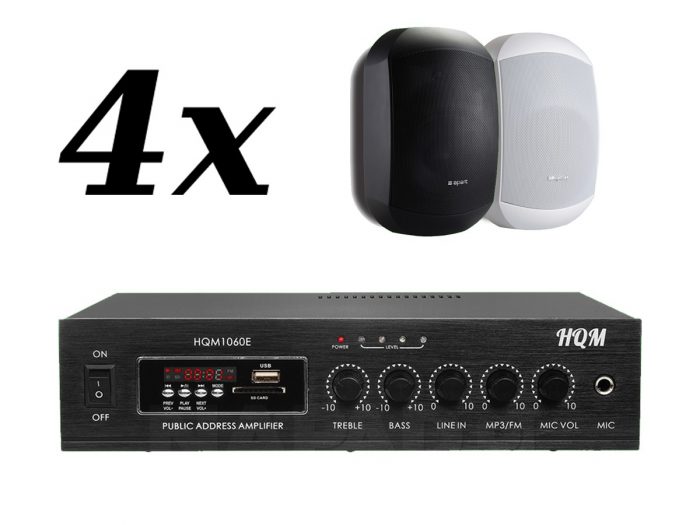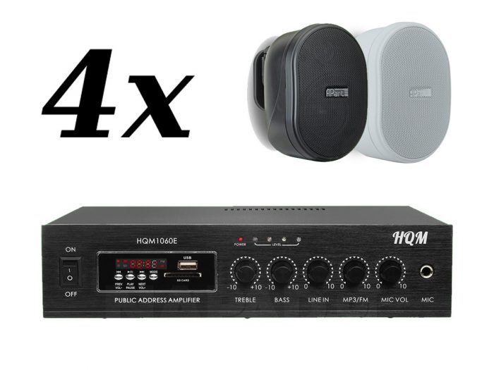 Zestaw przeznaczony jest do nagłośnienia powierzchni nie przekraczającej 60 m². W skład zestawu wchodzą: 4 głośniki naścienne APART MASK4CT, oraz wzmacniacz HQM 1060E