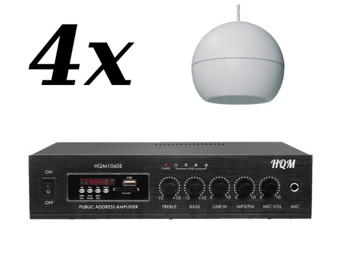 Zestaw przeznaczony jest do nagłośnienia powierzchni nie przekraczającej 60m². W skład zestawu wchodzą: 4 głośniki kulowe APART SPH16, oraz wzmacniacz HQM 1060E