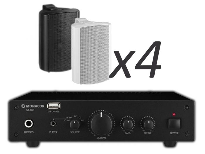 Monacor SA-100 + MKS-34 x4 – Nagłośnienie naścienne do 60m2
