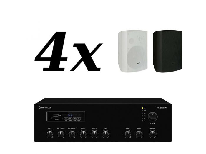 Zestaw przeznaczony jest do nagłośnienia powierzchni nie przekraczającej 60 m². W skład zestawu wchodzą: 4 głośniki naścienne RH SOUND BS-1050TS oraz wzmacniacz MONACOR PA-812DMP