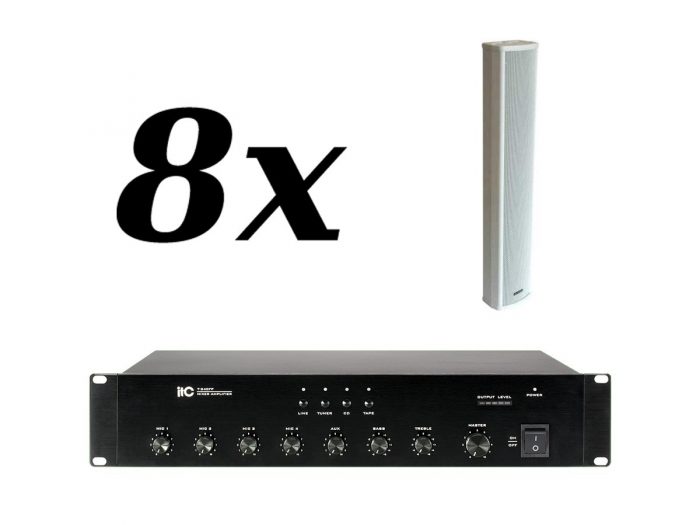 Zestaw przeznaczony jest do nagłośnienia powierzchni nie przekraczającej 150 m². W skład zestawu wchodzi: 8 kolumn naściennych RDUCH K3S-60 oraz wzmacniacz ITC T-240FP