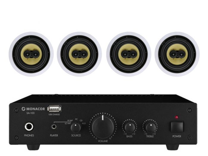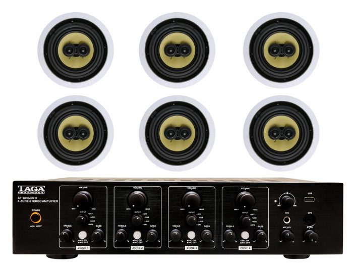 Zestaw przeznaczony jest do nagłośnienia powierzchni nie przekraczającej 60 m². W skład zestawu wchodzą: 4 głośniki sufitowe TAGA Harmony TCW-600R V.2, oraz wzmacniacz Monacor SA-100