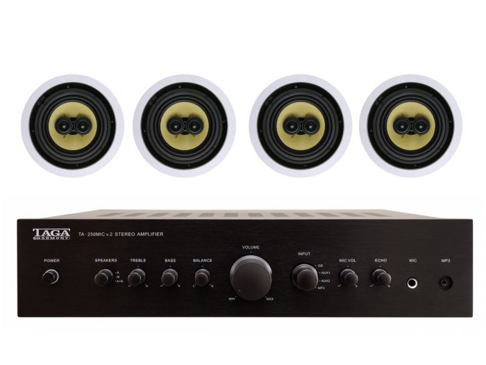 Zestaw przeznaczony jest do nagłośnienia powierzchni nie przekraczającej 60 m². W skład zestawu wchodzą: 4 głośniki sufitowe TCW-600R v.2, oraz wzmacniacz TA-250MIC,