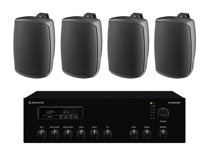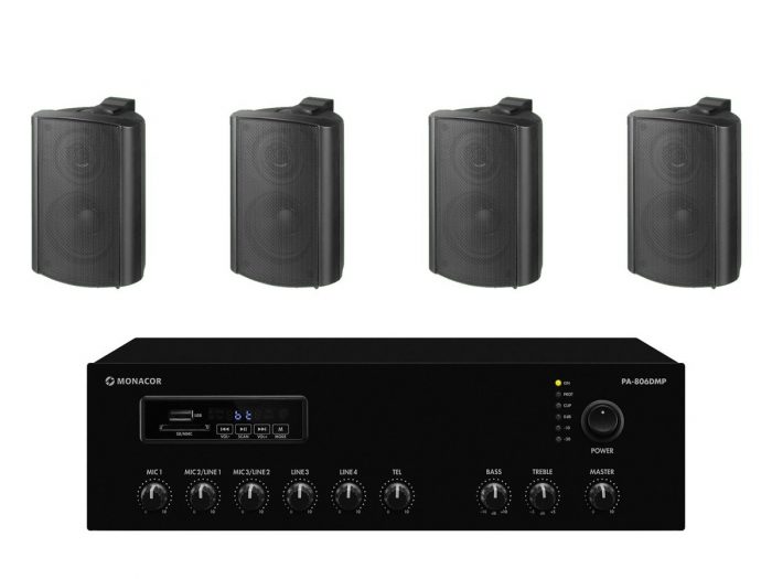 Zestaw przeznaczony jest do nagłośnienia powierzchni nie przekraczającej 60 m². W skład zestawu wchodzą: 4 głośniki naścienne MONACOR EUL-30, oraz wzmacniacz MONACOR PA-806DMP