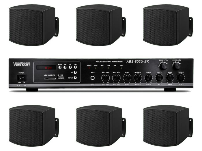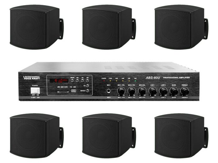 Zestaw przeznaczony jest do nagłośnienia powierzchni nie przekraczającej 100 m². W skład zestawu wchodzi: 6 głośników naściennych MONACOR EUL-26, oraz wzmacniacz VOICE KRAFT ABS-80U