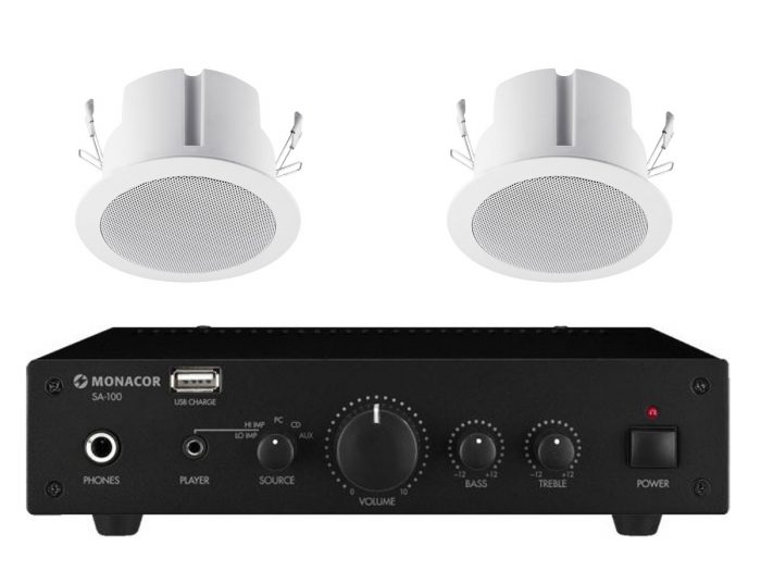 Zestaw przeznaczony jest do nagłośnienia powierzchni nie przekraczającej 30 m². W skład zestawu wchodzą: 2 głośniki sufitowe Voice Kraft QC 50T, oraz wzmacniacz Monacor SA-100