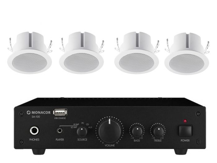 Zestaw przeznaczony jest do nagłośnienia powierzchni nie przekraczającej 60 m². W skład zestawu wchodzą: 4 głośniki sufitowe Voice Kraft QC 40T, oraz wzmacniacz Monacor SA-100
