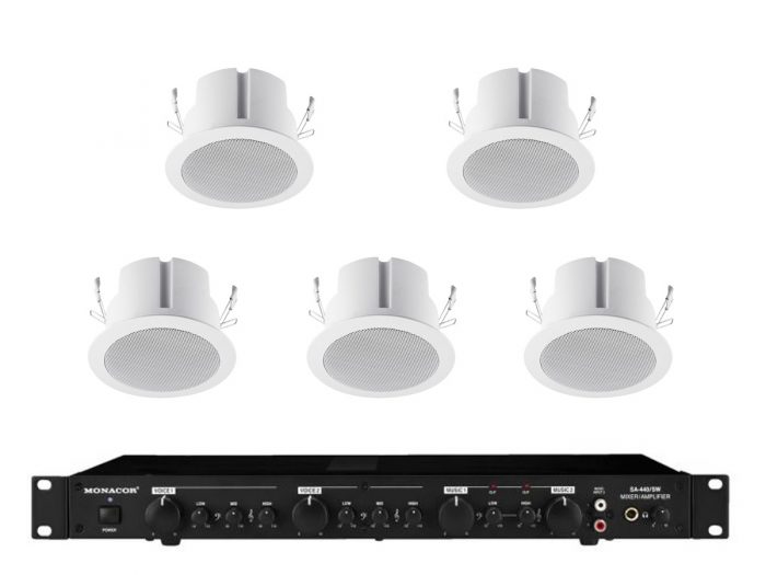 Zestaw przeznaczony jest do nagłośnienia powierzchni nie przekraczającej 60 m². W skład zestawu wchodzą: 4 głośniki sufitowe Voice Kraft QC 50T, oraz wzmacniacz Monacor SA-100