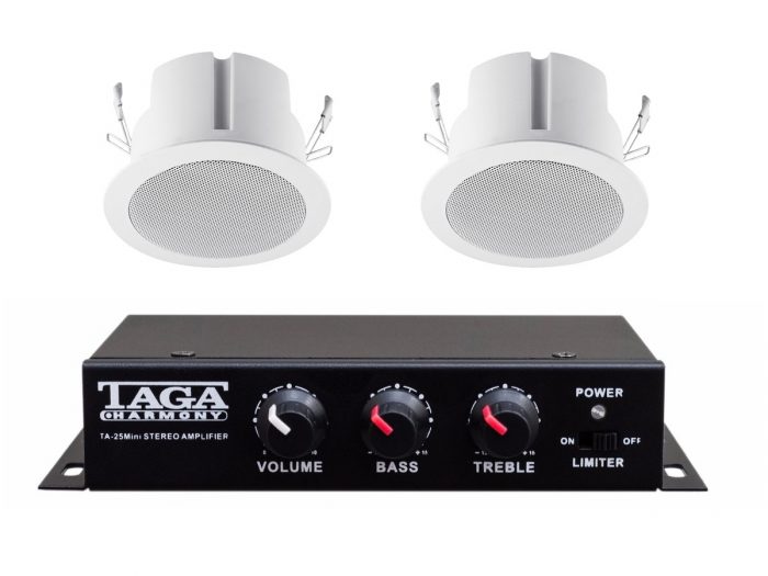 Zestaw przeznaczony jest do nagłośnienia powierzchni nie przekraczającej 30 m². W skład zestawu wchodzą: 2 głośniki naścienne Voice Kraft QC 50T, oraz wzmacniacz TAGA Harmony TA-25MINI o mocy 2 x 25W przy 8 Ohm,