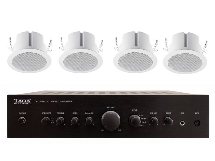 Zestaw przeznaczony jest do nagłośnienia powierzchni nie przekraczającej 60 m². W skład zestawu wchodzą: 4 głośniki sufitowe Voice Kraft QC 40T, oraz wzmacniacz TAGA Harmony TA-250MIC,