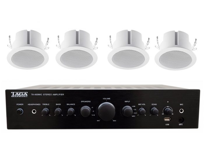 Zestaw przeznaczony jest do nagłośnienia powierzchni nie przekraczającej 60 m². W skład zestawu wchodzą: 4 głośniki sufitowe Voice Kraft QC 40T, oraz wzmacniacz TAGA Harmony TA-400MIC