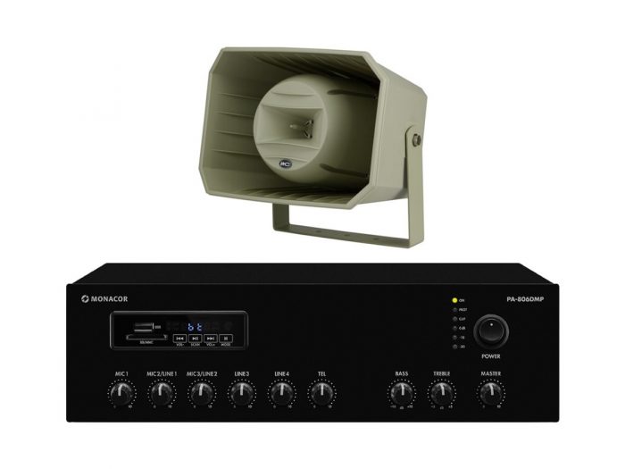 Zestaw przeznaczony jest do nagłośnienia powierzchni nie przekraczającej 30 m². W skład zestawu wchodzą: 2 głośniki tubowe ITC T-720A oraz wzmacniacz jednostrefowy MONACOR PA-806DMP