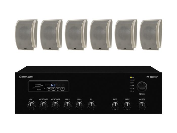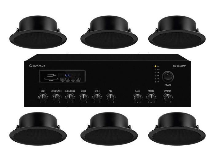 Zestaw przeznaczony jest do nagłośnienia powierzchni nie przekraczającej 100 m². W skład zestawu wchodzi: 6 głośników sufitowych MONACOR EDL-11TW/SW, oraz wzmacniacz MONACOR PA-806DMP