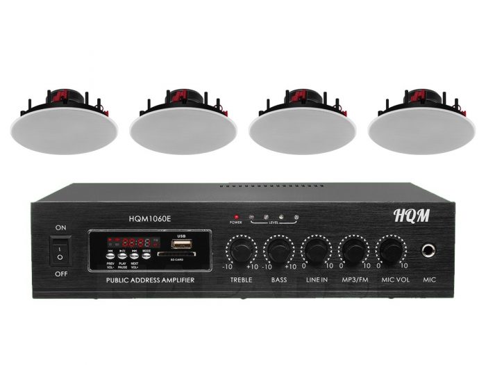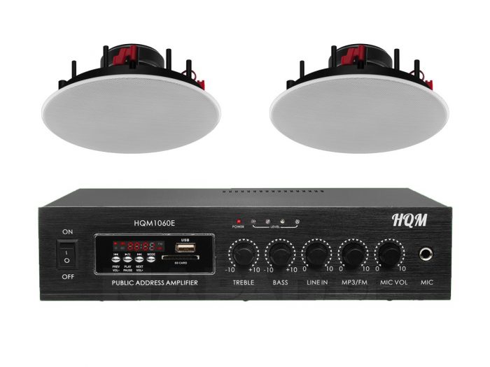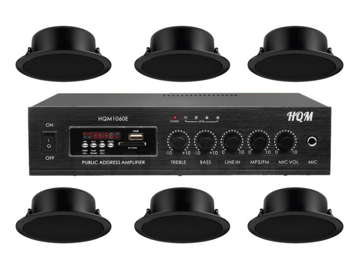 Zestaw przeznaczony jest do nagłośnienia powierzchni nie przekraczającej 100 m². W skład zestawu wchodzi: 6 głośników sufitowych MONACOR EDL-11TW/SW, oraz wzmacniacz 60W jednostrefowy HQM 1060E.