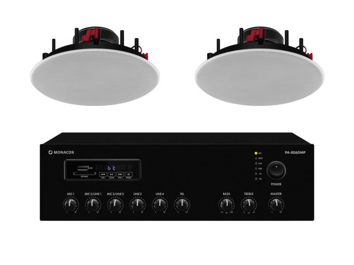 Zestaw przeznaczony jest do nagłośnienia powierzchni nie przekraczającej 30 m². W skład zestawu wchodzą: 2 głośniki sufitowe MONACOR EDL-82HQ, oraz wzmacniacz MONACOR PA-806DMP